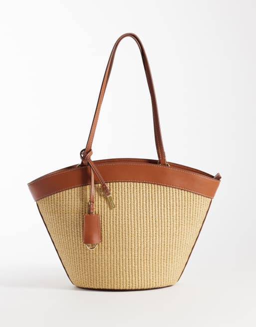 Mango - Geweven schoudertas met rand van imitatieleer in beige
