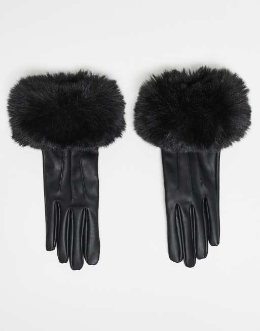 Mango - Handschoenen van imitatieleer met rand van imitatiebont in zwart