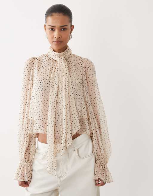 Mango - Hoogsluitende blouse met ruches in crème met zwarte stippen