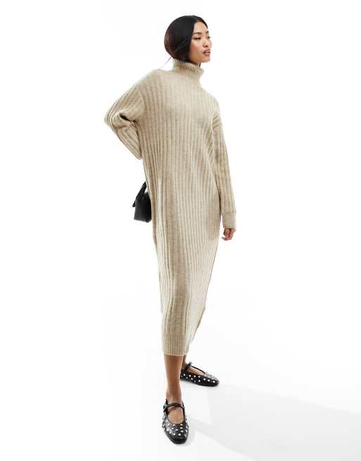 Mango - Hoogsluitende gebreide midi jurk in beige