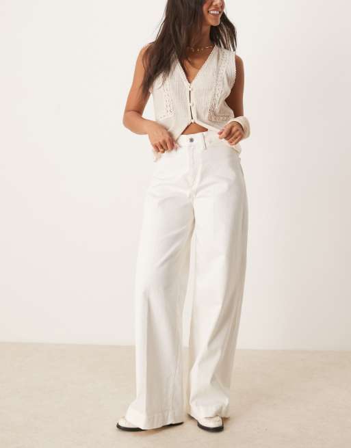 Mango - Jeans met wijde pijpen, hoge taille en plooien in wit