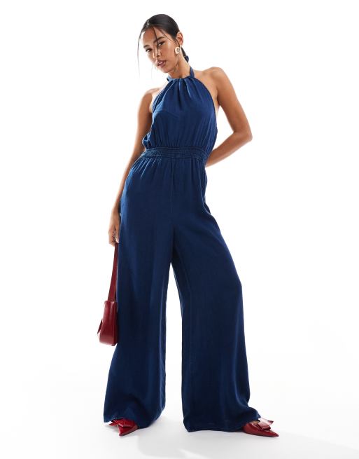 Mango - Jumpsuit met halternek en denimlook in donkerblauw