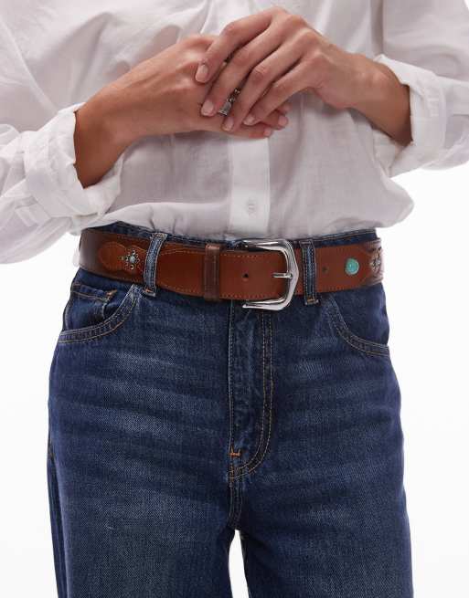 Mango - Leren riem met blauwe en zilver gemengde studs in bruin