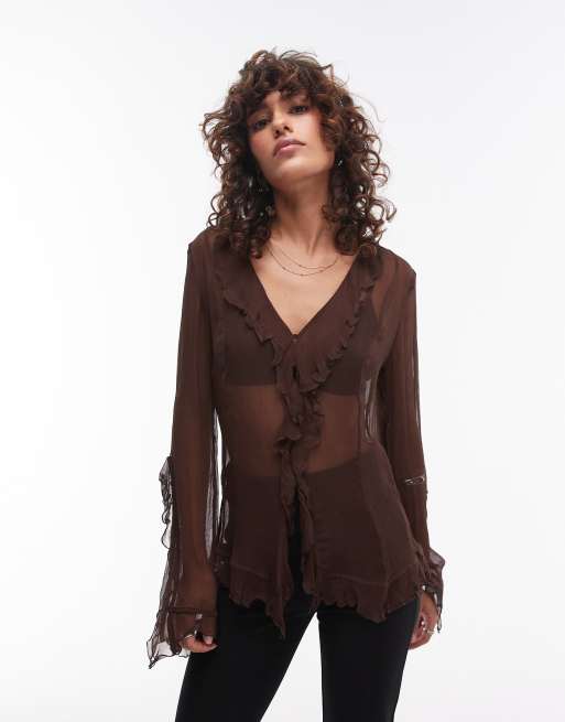 Mango - Mesh blouse met touwtjes in bruin