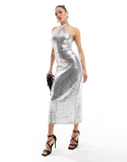 Mango - Midi-jurk met halternek en lovertjes in zilver