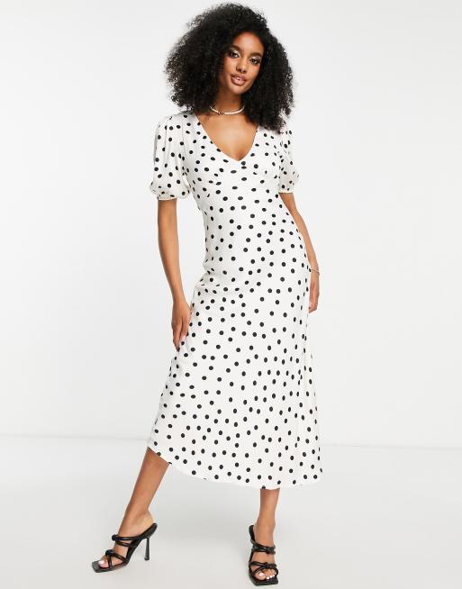 Mango - Midi-jurk met V-hals, pofmouwen en stippen in wit