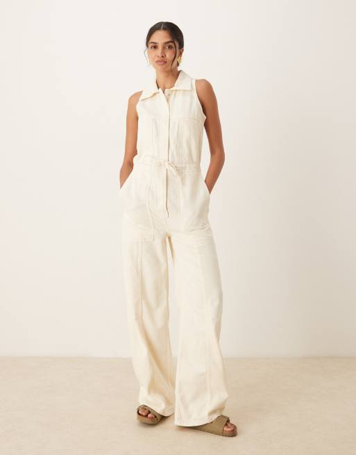 Mango - Mouwloze jumpsuit met kraagje, knoopsluiting en gestrikte taille in beige