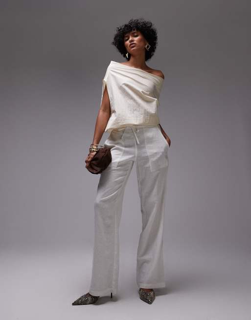 Mango - Satijnen top met rimpeleffect en blote schouder in ecru