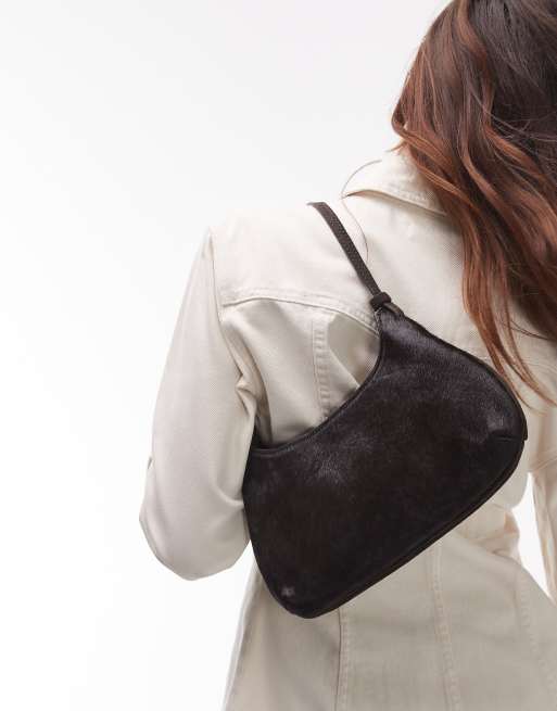 Mango - Schoudertas van echt leer met haar in donkerbruin