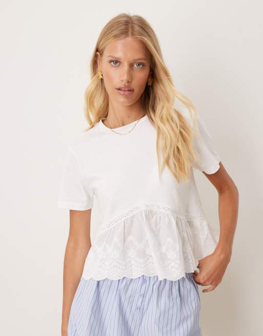 Mango - T-shirt van katoen met kanten zoom in wit