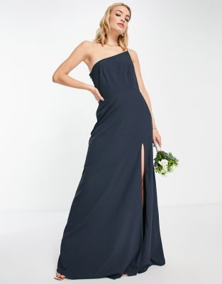 Maya - Bruidsmeisjes - Jurk met blote schouder en dijhoge split in marineblauw
