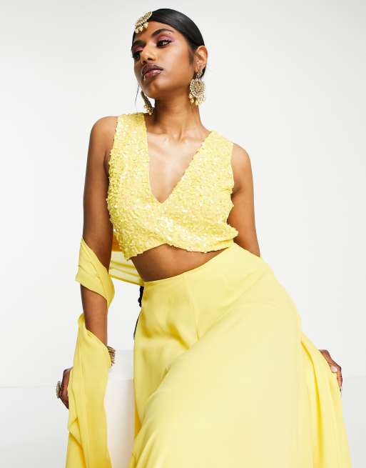 Maya - Cropped lehenga-top versierd met delicate lovertjes in geel