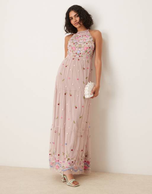 Maya - Geborduurde maxi jurk met halternek in mat roze