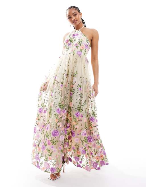 Maya - Lange galajurk met halternek en borduurwerk in multi