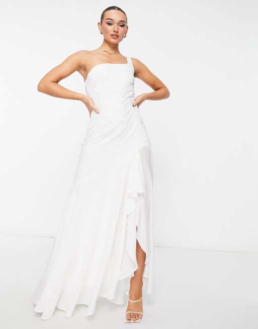 Maya - Maxi jurk met blote schouder en ruches in ivoor