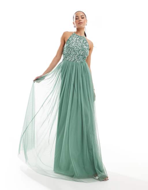 Maya - Maxi jurk met halternek en versiering in donker saliegroen