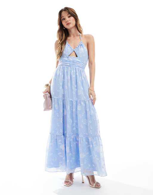 Maya - Midaxi-jurk met halternek en iriserende bloemenprint in lichtblauw