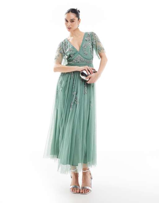 Maya - Midi-jurk met versierde korte mouwen in saliegroen