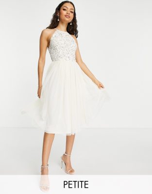 Maya Petite - Bruidsmeisjes - Midi-jurk met bardothals en tule in ecru met fijne lovertjes in dezelfde tint