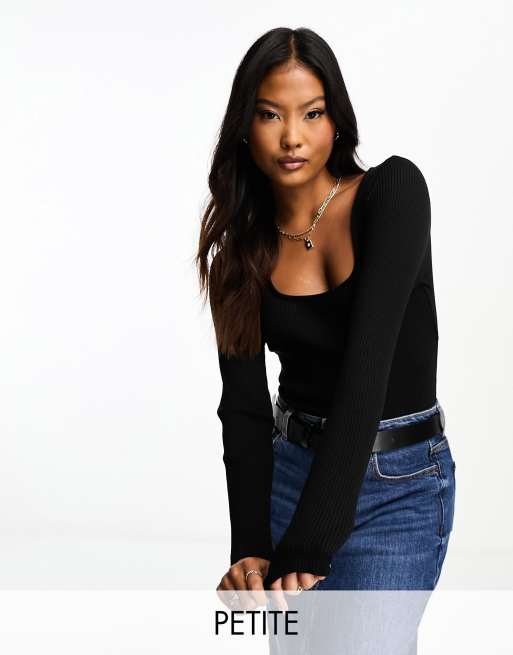 Miss Selfridge Petite - Geribbelde body met vierkante hals in zwart