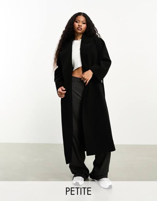 Miss Selfridge Petite - Lange jas met overslag en ceintuur in zwart