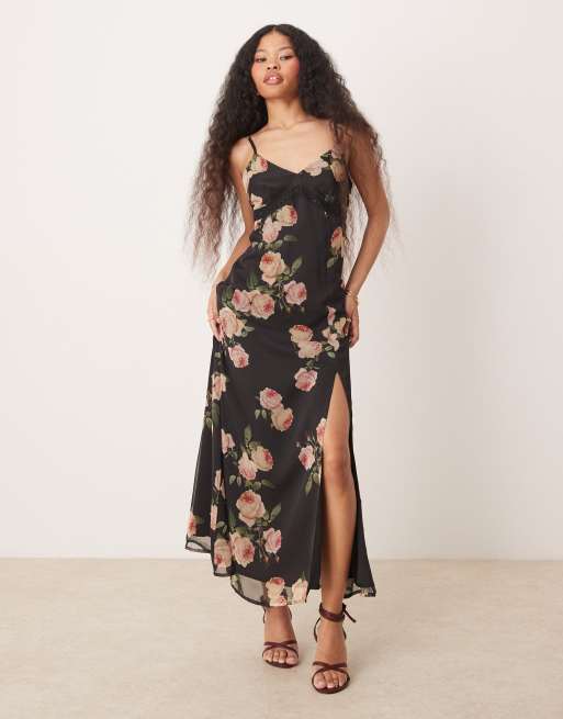 Miss Selfridge Petite - Maxi slipdress van chiffon met kanten rand en oversized rozenprint