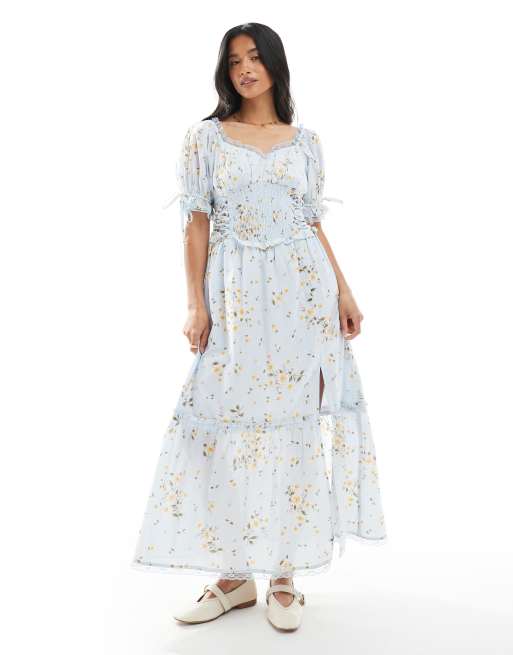 Miss Selfridge Petite - Melkmeisjes maxi jurk in blauw met bloemenprint