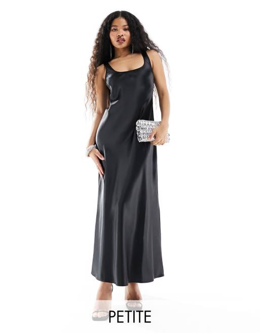 Miss Selfridge Petite - Schuingesneden satijnen maxi jurk met lage ronde hals in zwart