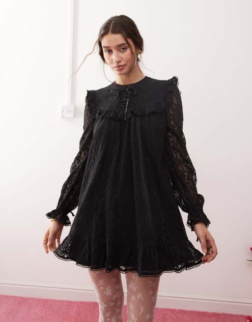 Miss Selfridge - Aangerimpelde jurk met strik en kant in zwart