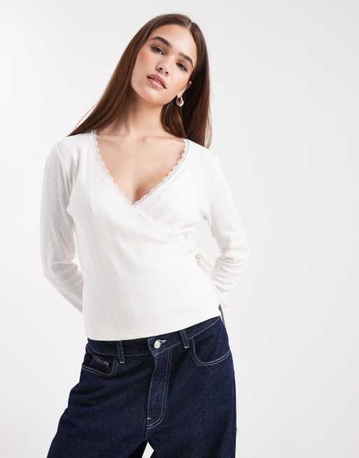 Miss Selfridge - Ajourgebreide overslagtop in crème
