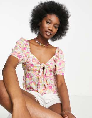 Miss Selfridge - Blouse met strik, uitlopende mouwen en veelkleurige bloemenprint