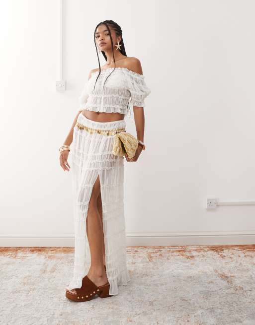 Miss Selfridge - Doorschijnende gesmokte maxi strandrok in crème