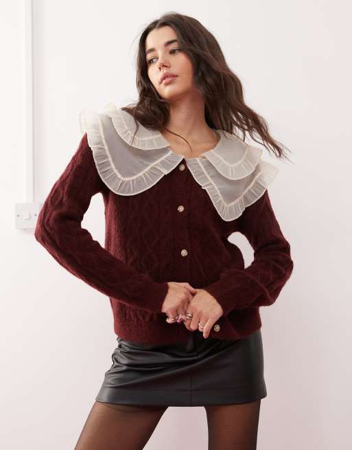 Miss Selfridge - Gebreid vest met kabels en contrasterende kraag in wijnrood