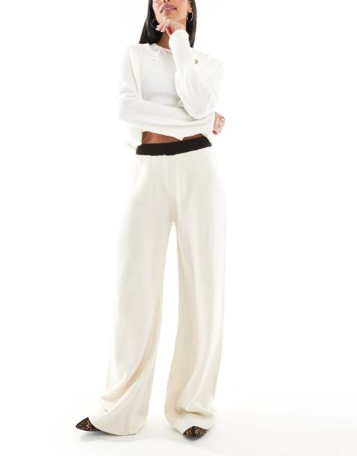 Miss Selfridge - Gebreide broek met wijde pijpen en contrasterende tailleband in chocoladebruin