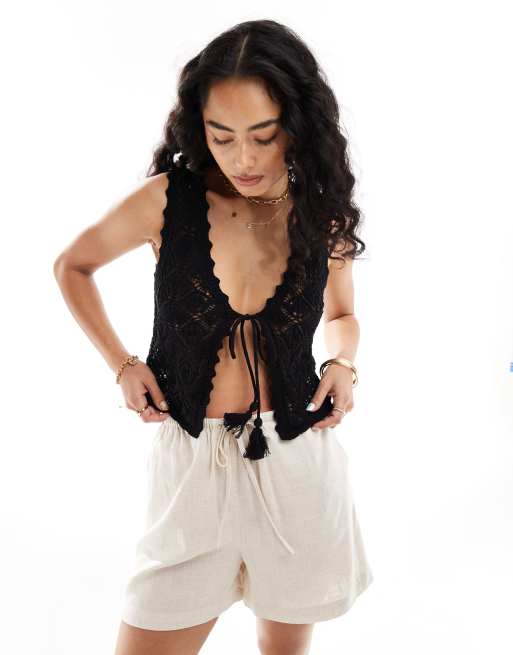 Miss Selfridge - Gehaakte mouwloze top met gestrikte voorkant in zwart