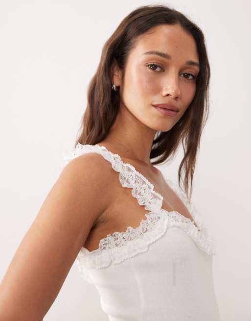 Miss Selfridge - Geribbelde body met kanten ruches in crème