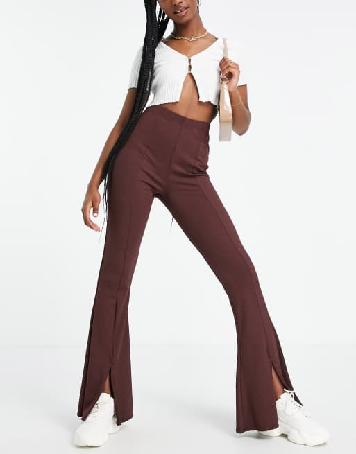 Miss Selfridge - Geribbelde broek met split aan de voorkant in chocoladebruin