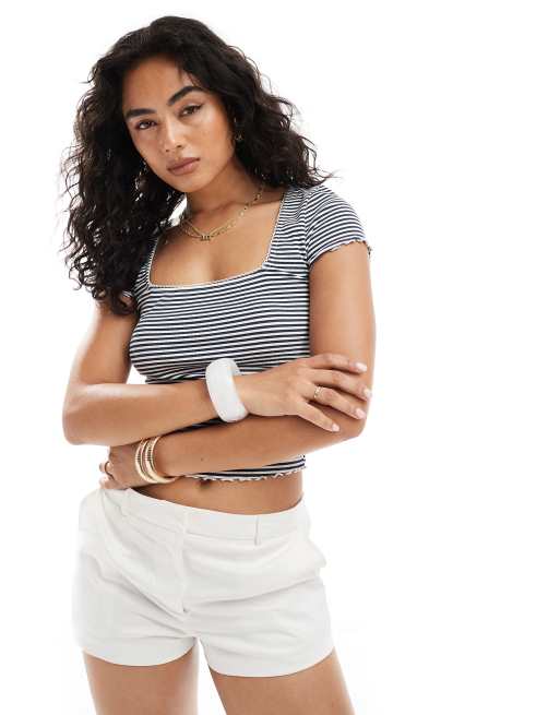 Miss Selfridge - Geribde gestreepte top met korte mouwen en kant