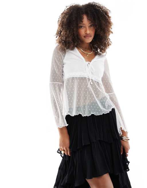 Miss Selfridge - Kanten top met lange uitlopende mouwen en peplum in ivoorwit
