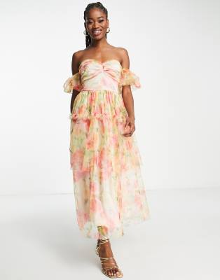 Miss Selfridge - Lange jurk van tule met gedraaide voorkant en veelkleurige bloemenprint