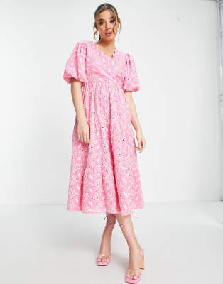 Miss Selfridge - Midi wikkeljurk met broderie in felroze
