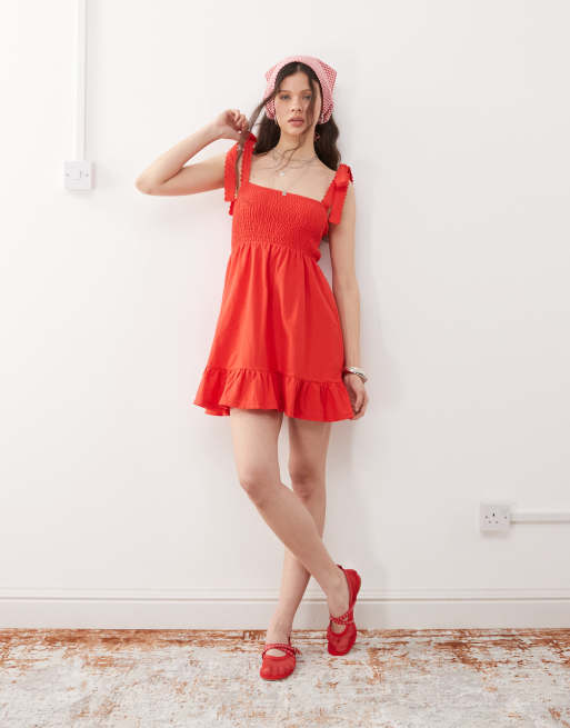 Miss Selfridge - Mini jurk met gesmokt detail en gestrikte schouderbandjes in rood