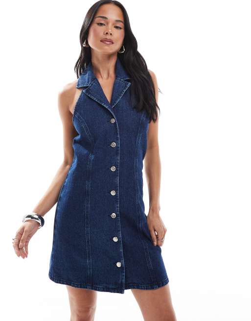 Miss Selfridge - Mini jurk met kraagje en halternek in mid wash