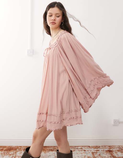 Miss Selfridge - Mini jurk met vierkante hals en uitlopende mouwen in lichtroze