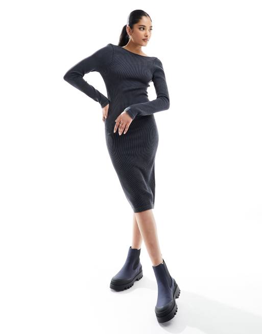 Miss Selfridge - Naadloze geribbelde midi-jurk met lange mouwen in antraciet met wassing