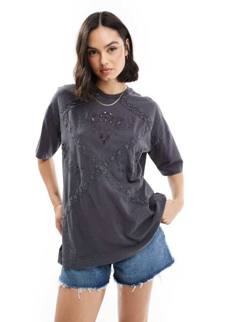 Miss Selfridge - Oversized T-shirt met kantborduursels in antraciet met acid wash