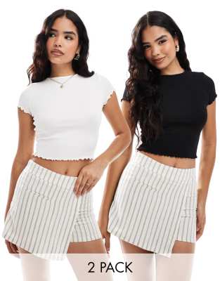 Miss Selfridge - Set van 2 geribbelde T-shirts met korte mouwen en geschulpte rand in zwart en wit