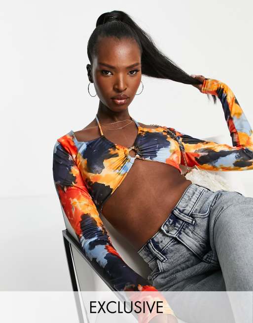 Missy Empire - Exclusives - Crop top met halternek en uitsnijdingen in veelkleurige print, deel van co-ord set