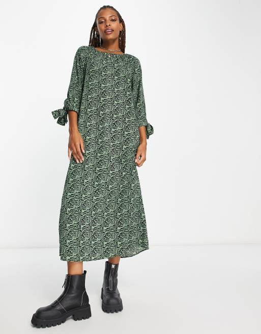 Monki - Aangerimpelde midi jurk met gestrikte mouwen en groene wervelprint