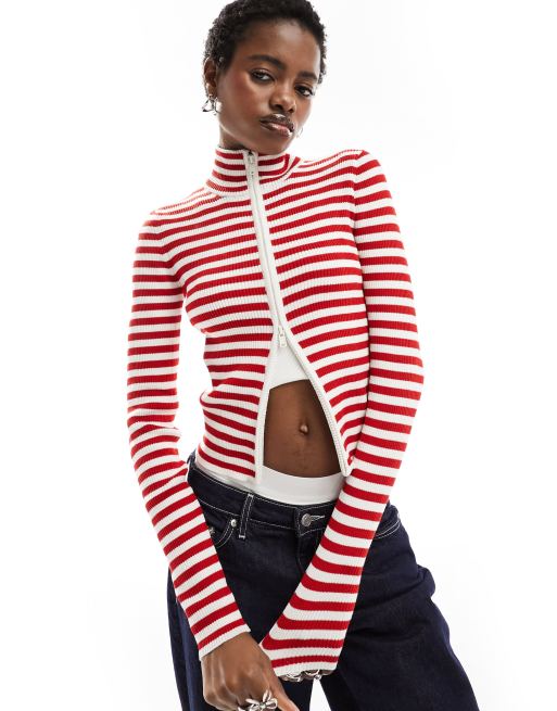 Monki - Cropped gebreid vest met rits aan de voorkant en strepen in rood en beige
